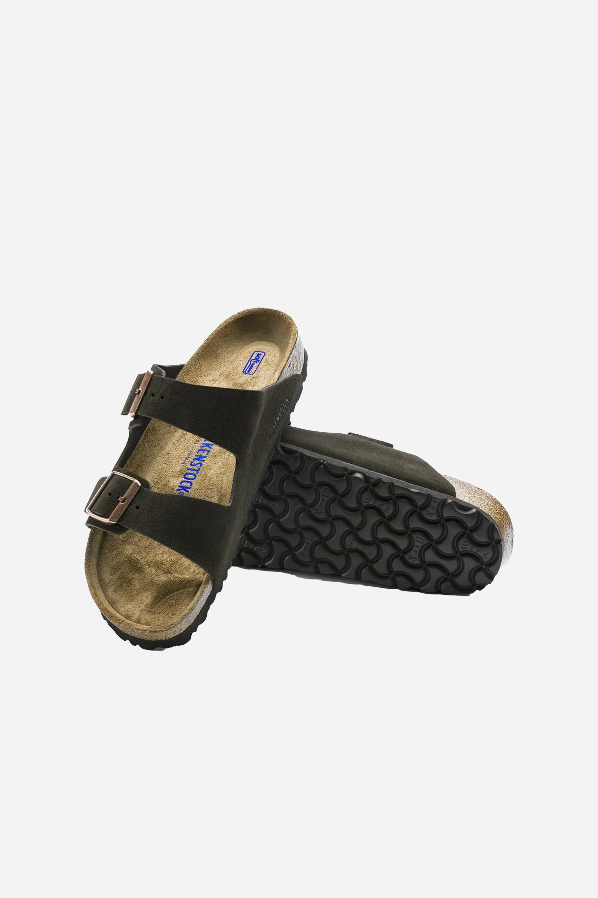 Arizona Suede Mocca fra Birkenstock. Disse sandaler er fremstillet i Anatomisk formet kork-latex-fodseng der er særligt blød. De er designet med to stropper i ruskind som justeres med spænder. Spænderne kan justeres individuelt.
