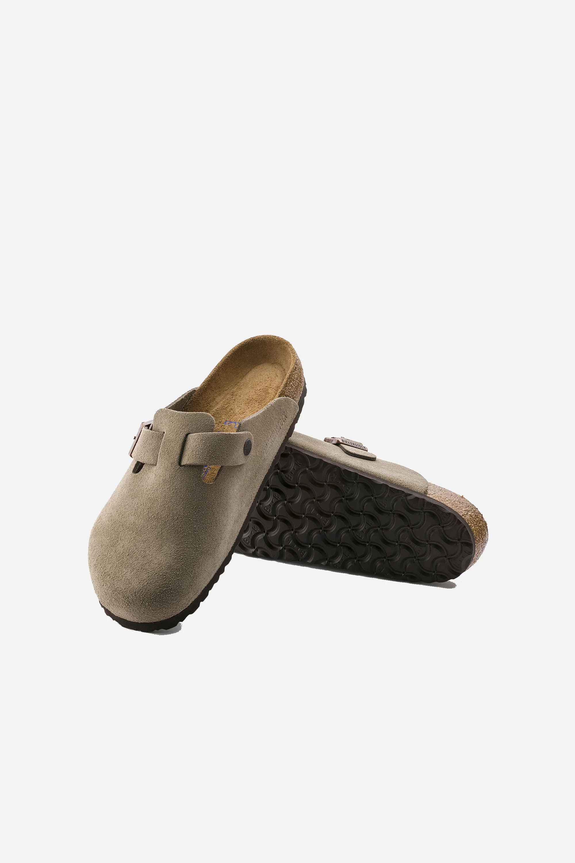 Boston Suede Taupe fra Birkenstock. Disse sandaler er fremstillet i Anatomisk formet kork-latex-fodseng der er særligt blød. De er designet med en lukket snude i ruskind som kan justeres med spænde.