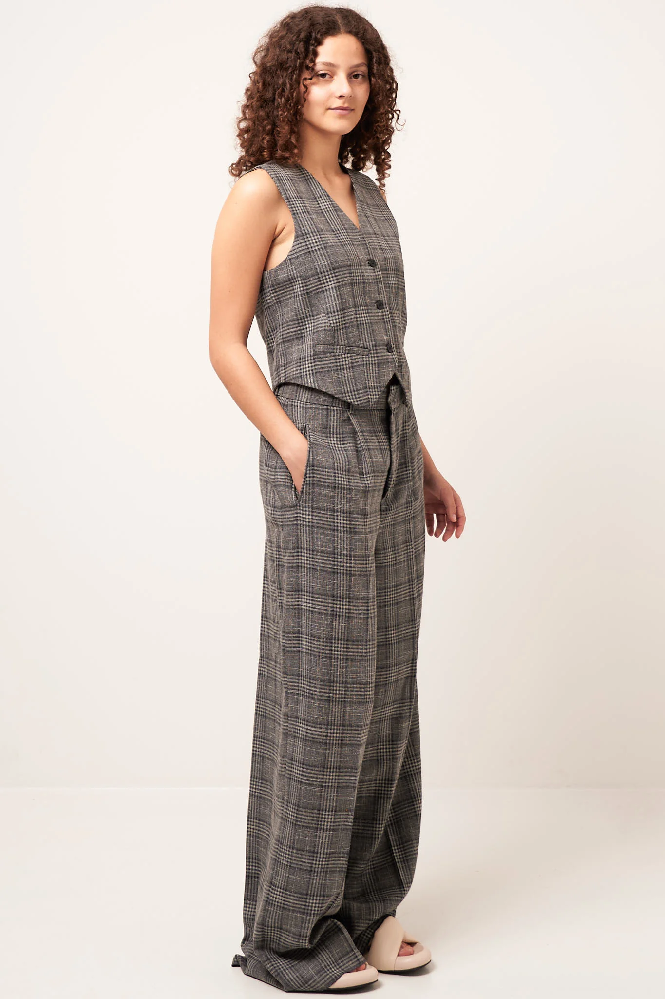 Denne vest er produceret i Italien og fremstillet i deadstock metervare fra et internationalt anerkendt modehus og kommer i et begrænset antal. Vesten er designet i en kort og tæt pasform. Den er designet med to lommer fortil og knaplukning.