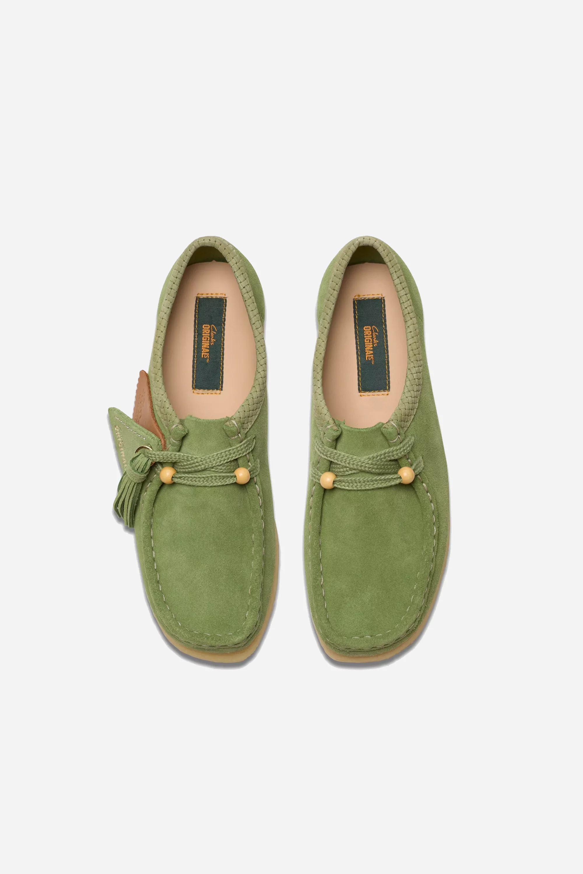 Wallabee Apple Suede fra Clarks Originals. Disse sko er fremstillet i ruskind med en gummisål. De har en snørelukning med to huller og er designet med dekorative syninger og perler.